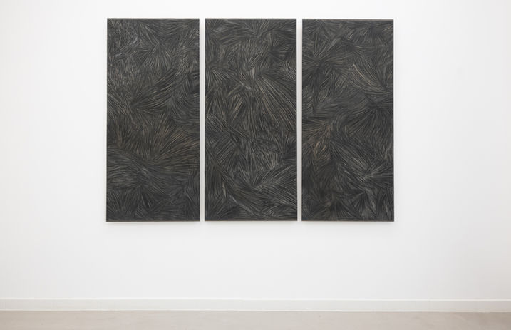 Before the line, there is the trace. When all intention is removed from the line, what remains is the trace: a mechanical act, testifying to the transit of a being or an object. The " Exhaustion of the Tool " series pushes drawing towards a form of nudity. Here, drawing is reduced to an oscillation, on the verge of absurdity. It’s about exhausting a tool (her a pencil) on a sheet of sandpaper until it disappears, covering the surface with traces. The stripping-down nature of the gesture distances it from any intention: the act is not subject to a goal or an idea of beauty. A sense of silence emerges, a space of discretion. The abrasive surface of the sandpaper consumes the material of the painting tool (charcoal, plaster or parafin), leaving a layer of particles. The surface preserves the imprint of the sanding, the memory of the movement. The drawing here takes on a performative dimension: an oscillatory phenomenon, produced in a single block of time, as a measure of time and space.