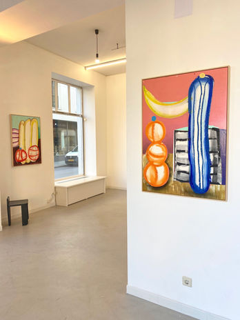 The ‘Fruit Loops’ series consists of a stylized and ultra-contemporary representation of the classic genre of the still life. The artist leaves the question open as to whether his painted still lifes are fruits and vegetables, sex toys or inflatables. Mangen’s usual power and dynamic brushstrokes remain, only somewhat calmer and more structured. This results from the fact that the artist made preparatory sketches on paper for this series, which he usually never does.
